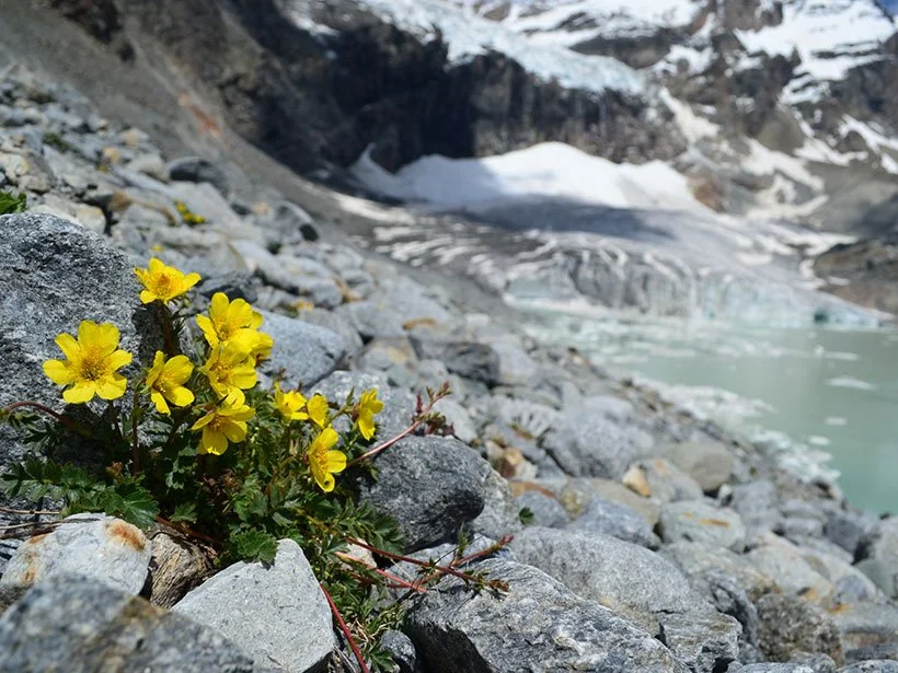 Geum reptans (creeping avens) is an alpine plant sometimes used to make génépi, an herbal liqueur. These creeping avens are flowering at the toe of Trobio glacier in Italy, one of the retreating glaciers around which biodiversity has shrunk. Credit: Duccio Tampucci